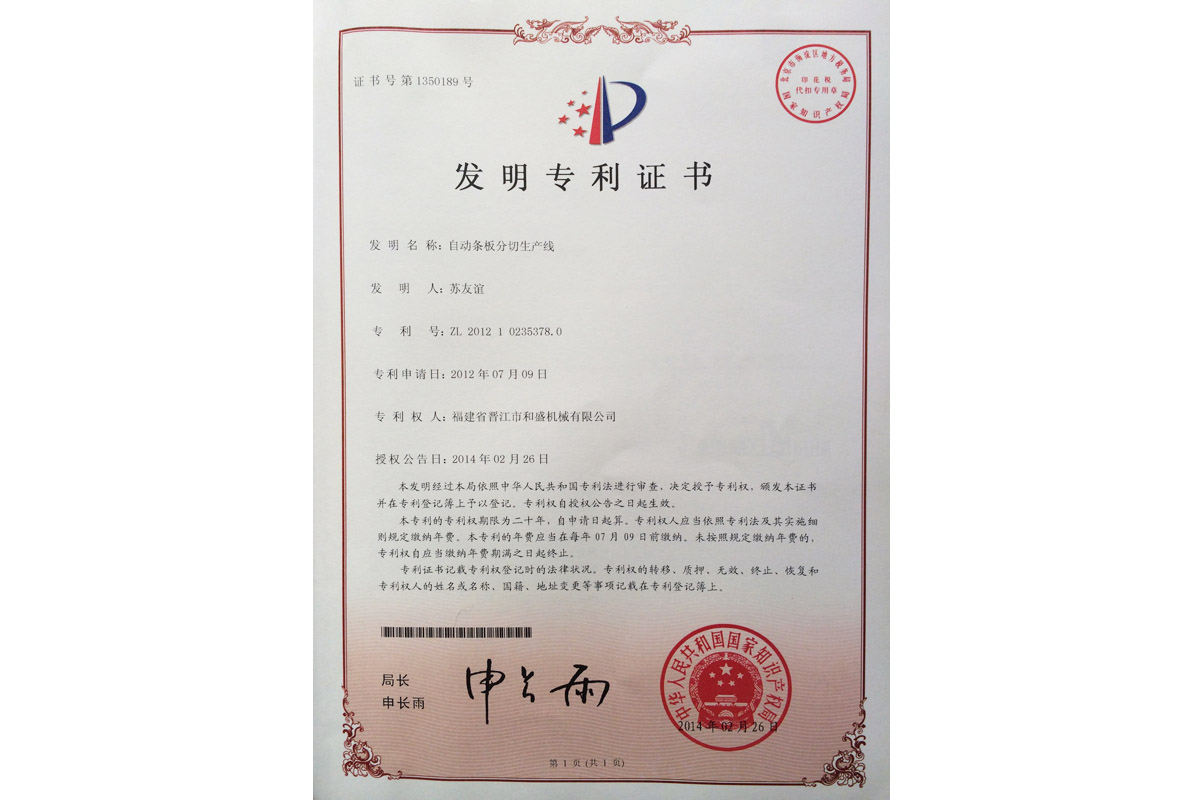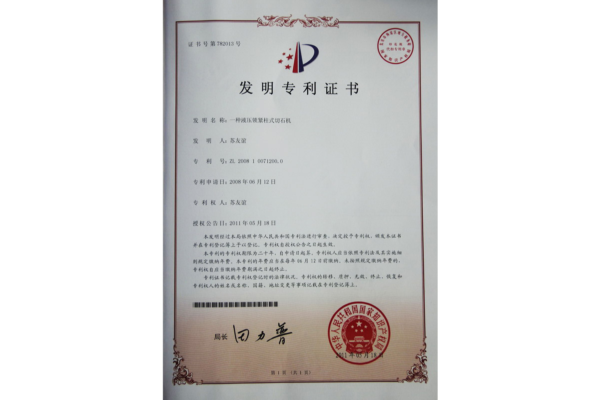 雙鎖緊橋式切石機(jī)發(fā)明專利證書(shū)