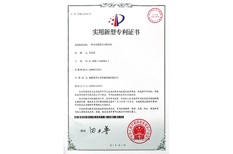 一種多功能組合式磨光機(jī)實(shí)用專利證書(shū)